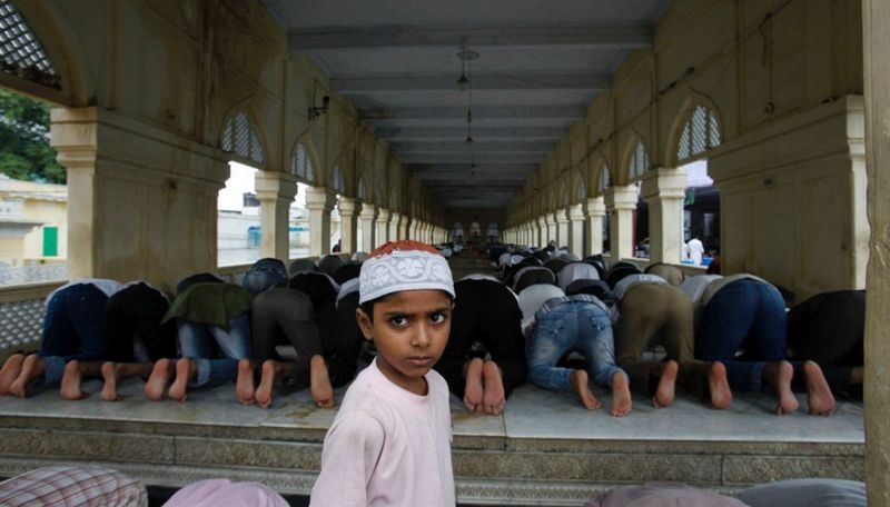 在印度的一個清真寺,一個小男孩經過一個正在祈禱的老人。(海得拉巴,7月12日)