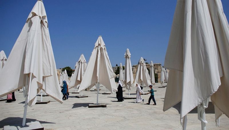 以色列人走過路旁的遮陽傘。(耶路撒冷,7月8日)