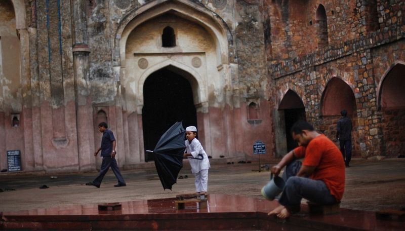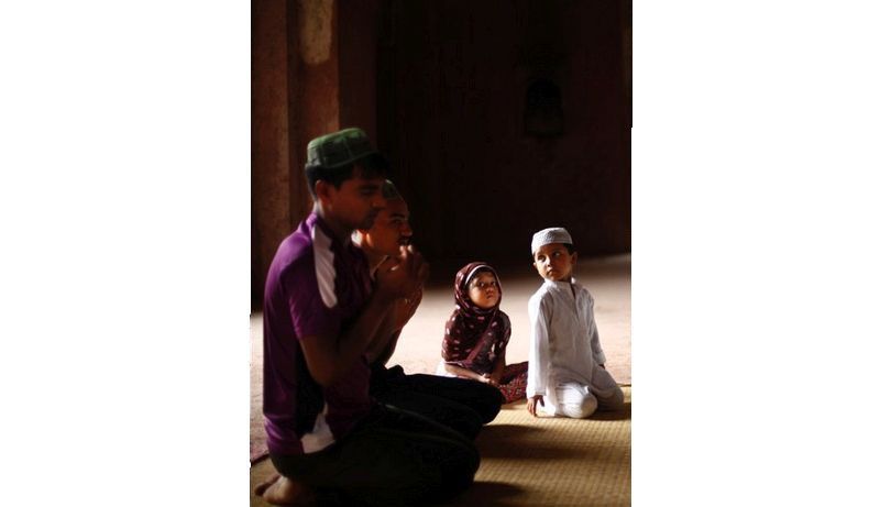 大人在清真寺裡祈禱,孩子在一旁觀看。(新德里,7月12日)