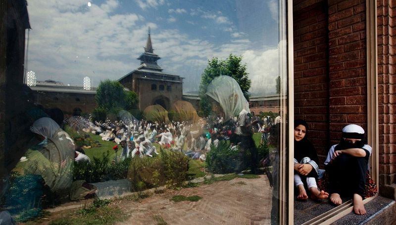 在印度,玻璃外是男子的倒影,玻璃內是女子在哈福清真寺(或大清真寺)裡祈禱。(斯利那加,7月12日)