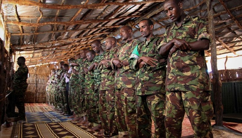 在索馬里南部的一個港口城市Kismayo,非洲聯盟駐索馬里特派團的穆斯林士兵,在軍事基地內祈禱。(基斯馬尤,7月 16日)
