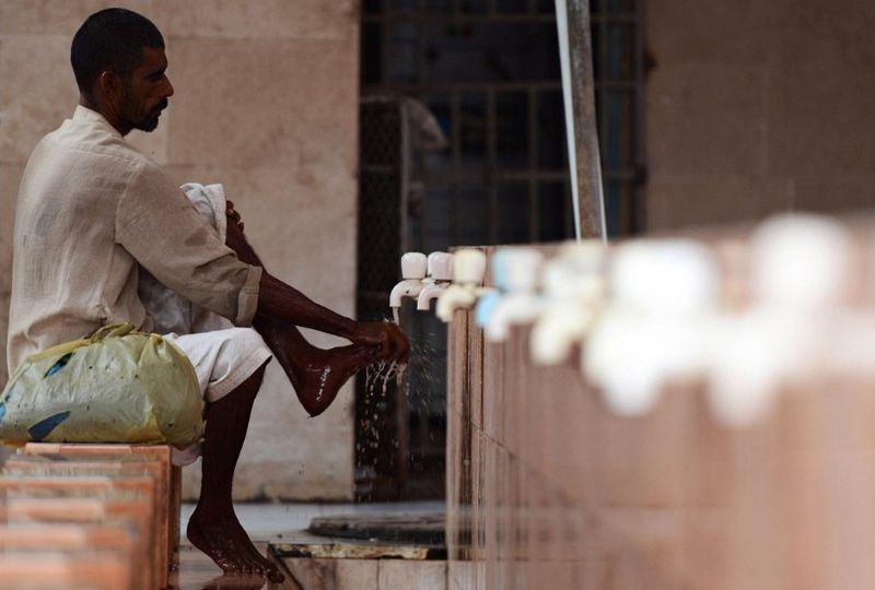 在巴基斯坦的一座清真寺,一名男子在祈禱之前洗腳。(卡拉奇,7月16日)