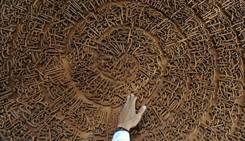 在印尼,一個伊斯蘭寄宿學校裡,一名老師出示《古蘭經》的雕刻。(Parung,7月16日)