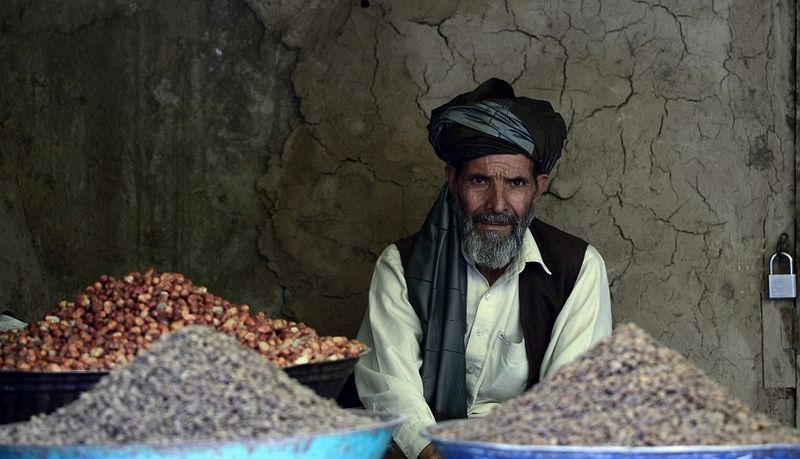 一名阿富汗的乾果商人,在老市場上等待客戶上門。(喀布爾,7月8日)