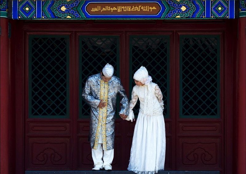 一對新婚夫婦在牛街清真寺前(Niujie Mosque)擺拍婚紗照。(北京,7月16日)