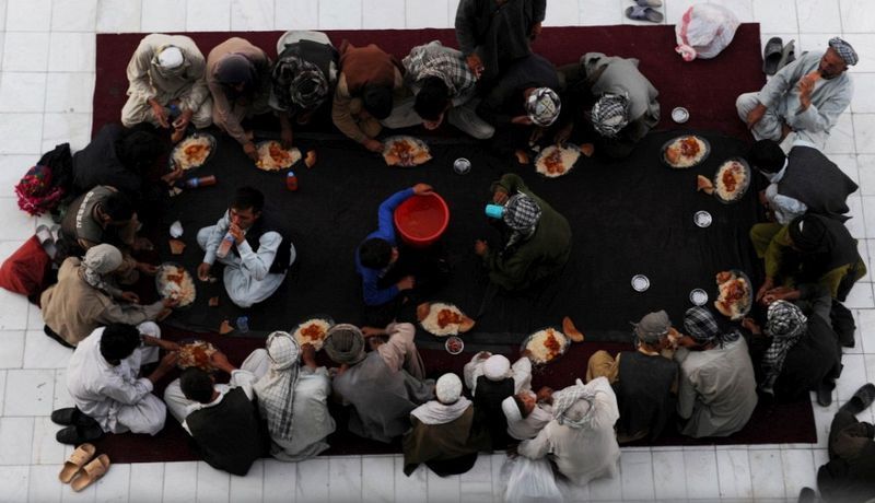 在阿富汗北部,一些男子在藍色清真寺(Hazrat Ali聖殿)裡用開齋飯。(馬扎里沙里夫,7月17日)