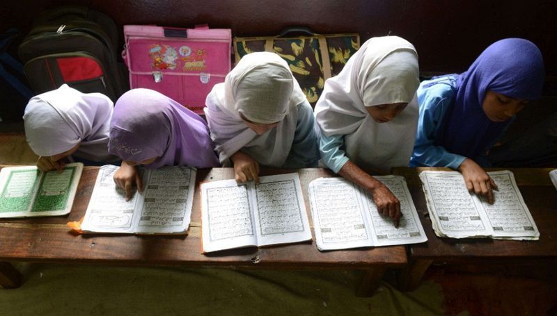 在印尼,學生們圍坐成圈,誦讀《古蘭經》。(棉蘭,7月10日)
