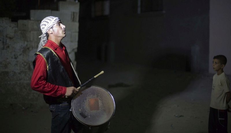在巴勒斯坦,擔任「黎明喚醒者」(Musaharati)的Mohammad al-Jamalah用鼓聲喚醒穆斯林起來,趕在白天禁食之前 吃早餐。(加薩,7月18日)
