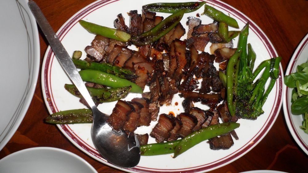 記得小時候,青黃不接的“困月”,母親在燉菜,特別是燉豆角前,總會切上幾片鹹臘肉“爆鍋”,給我們解饞。熱鍋翻炒鹹肉片子,滿屋飄香,會讓我們垂涎欲滴。好吃的鹹 臘肉,在切片入鍋之前,清洗可是個細致活兒。母親先將鹹臘肉放在盆中用冷水泡上一夜,第二天再很有耐性地刮去表麵的油醬汙垢。燉好的菜端上桌,頓時醇香撲 鼻,盤子裏有限的幾片鹹臘肉色澤紅亮,我會第一時間夾起一小片入口品咂,肥而不膩,硬不塞牙,糜而不爛,爽口養身。一家人坐在桌前,細細品嚐這世間 美味,有說不出的暢快和幸福。