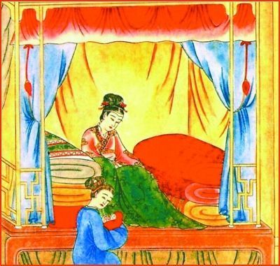 古代最著名的一床鴛鴦被是後蜀主孟昶的。據元陶宗儀《南村輟耕錄》:『鴛衾,孟蜀主一錦被,其闊猶今之三幅帛,而一梭織成。』陶宗儀之所以記下孟昶這床鴛鴦被,是因為這床雙人被的形制很特別,古今僅見:『被頭作二穴,若雲版樣,蓋以叩於項下。如盤領狀,兩側餘錦則擁覆於肩。』把被頭挖成衣領樣,蓋在身上剛好露出兩個腦袋。