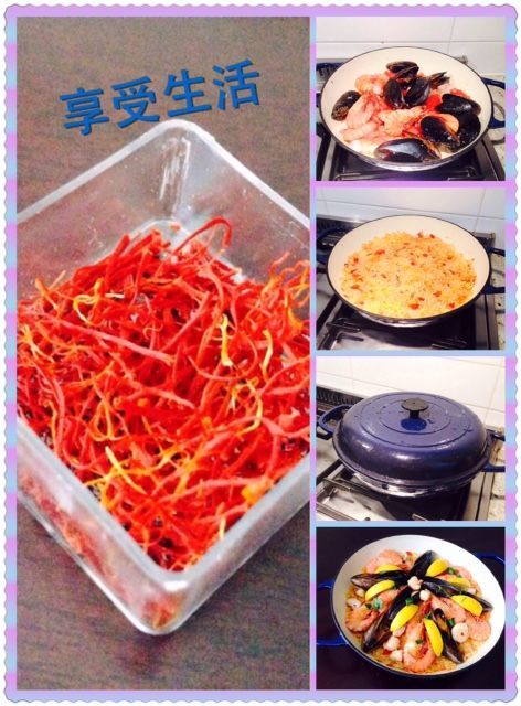 大蝦開背去蝦線,鮮貝肉清洗幹淨,魷魚去掉內髒和軟骨,撕去紅色的表皮後切成粗條或小塊,貽貝刷洗幹淨,處理好的海鮮都瀝幹待用 。洋蔥、甜椒、番茄都洗淨切成小丁,蒜頭壓成蒜蓉,歐芹洗淨切碎待用高湯用另一個小鍋燒到熱而不沸待用。平底鍋內放一點橄欖油,中火炒香洋蔥3分鍾至透明,下蒜蓉略炒下番茄、甜椒和歐芹(留一點最後擺盤用)炒2分鍾至番茄出汁甜椒略軟 。放米和番紅花繼續翻炒2分鍾,加入白葡萄酒。等酒氣揮發掉後倒入所有高湯,湯麵要剛剛浸沒米,加鹽和黑胡椒調味。轉小火煮15-20分鍾,不要翻動。等基本上看不到水分的時候將所有海鮮均勻的鋪在飯上,並往下輕輕按壓至半埋在飯中,擠上檸檬汁(約1/3個檸檬)10分鍾後開蓋把飯和海鮮翻勻,最後轉中大火等待3分鍾,出鍋後撒上歐芹碎、巴西裏碎擺上檸檬即可。