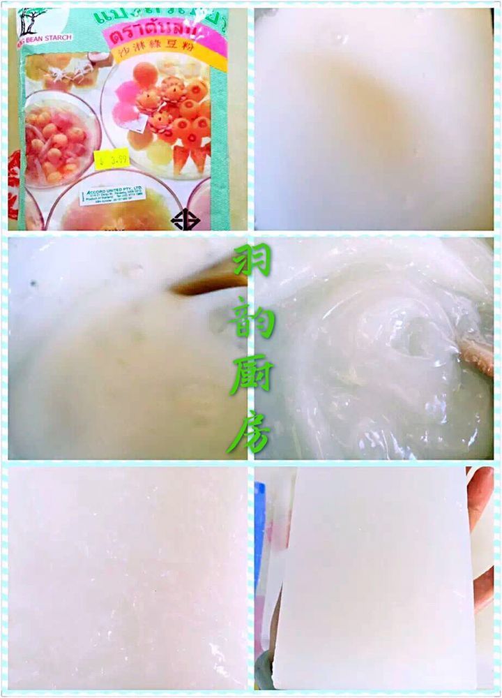 1,綠豆涼粉配方中,綠豆澱粉與水的比例是1:6,其實1:5-1:8都是可以的,水少做出來的涼粉比較硬、脆,顏色白得厚重些,水多則軟,白色較淺,透明度更高。