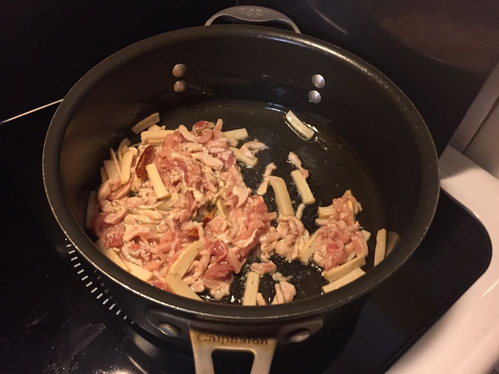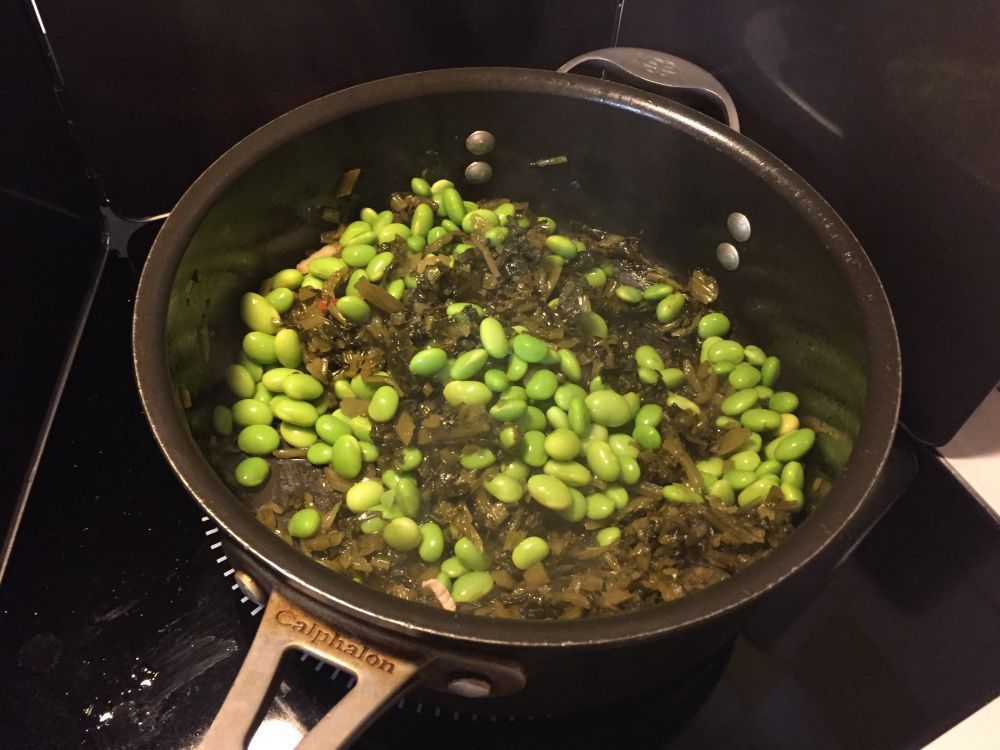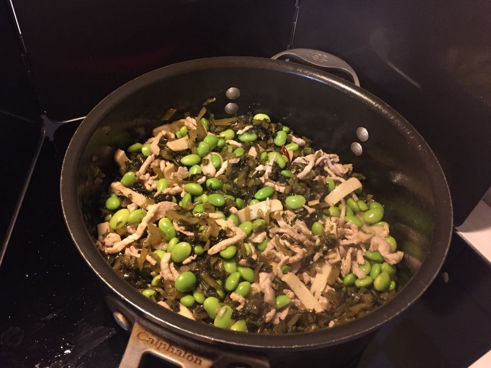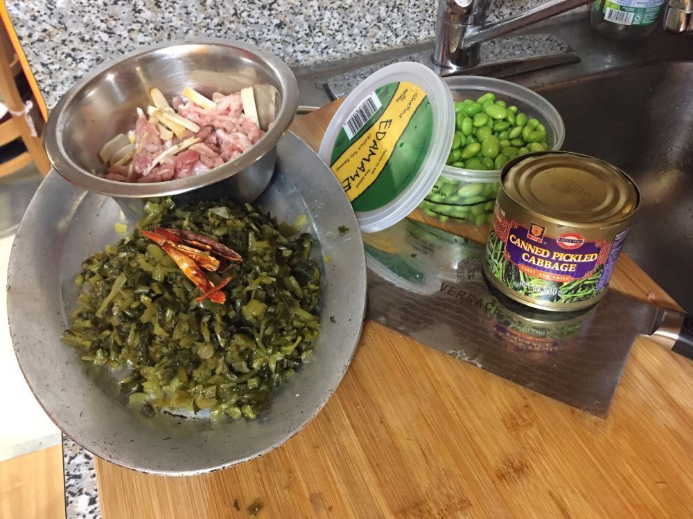 所以就有了老法子的毛豆子炒鹹菜,雪菜還是梅林牌罐裝的呢!這菜要下啥麽才對呢?