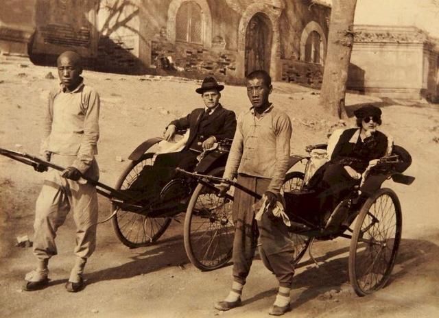1936-1938,外國人在北平乘洋車遊覽。