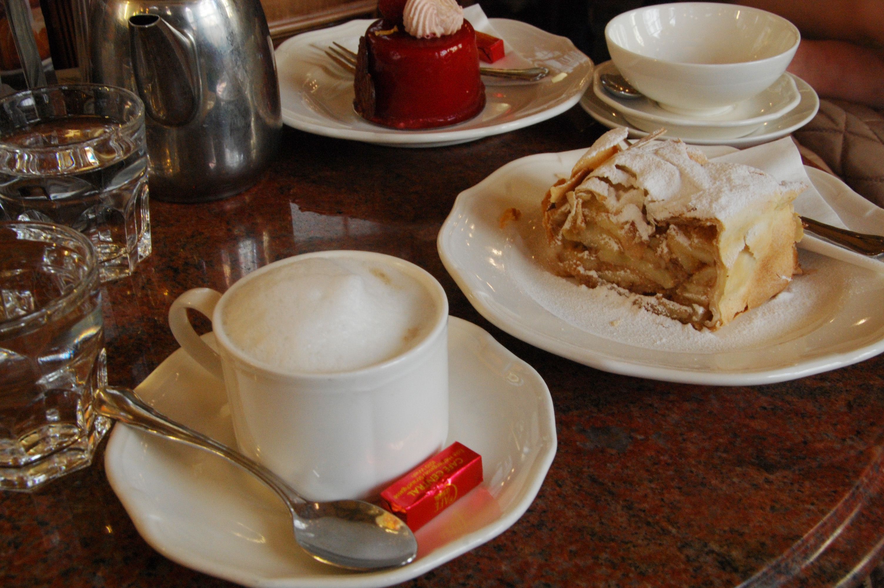 图:维也纳最著名的中央咖啡馆的”Melange”咖啡和苹果馅饼,以及专为母亲节准备的母亲节蛋糕
