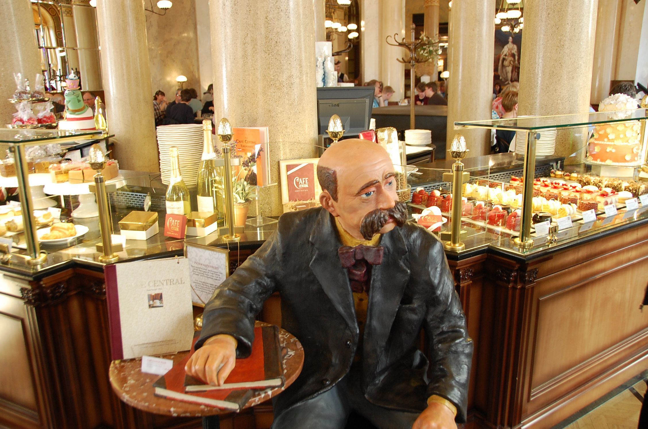 图:老客人彼得·阿尔滕贝格(Peter Altenberg)的雕塑在中央咖啡馆正门口处