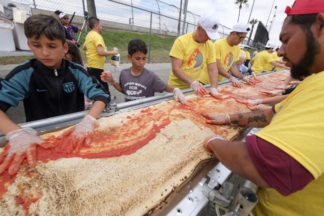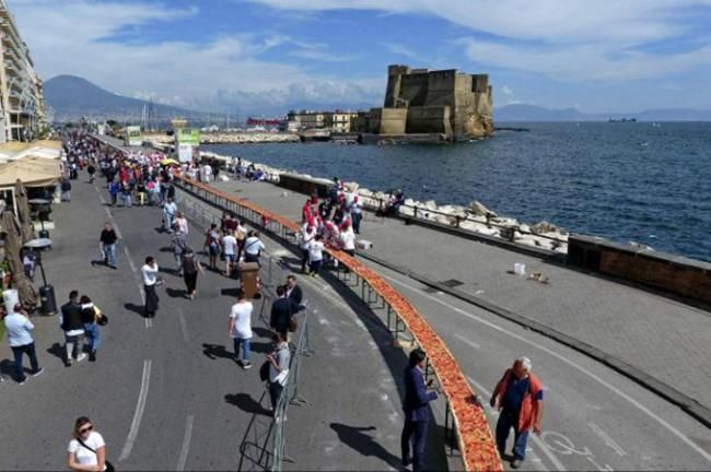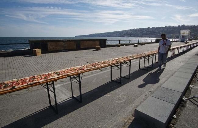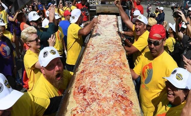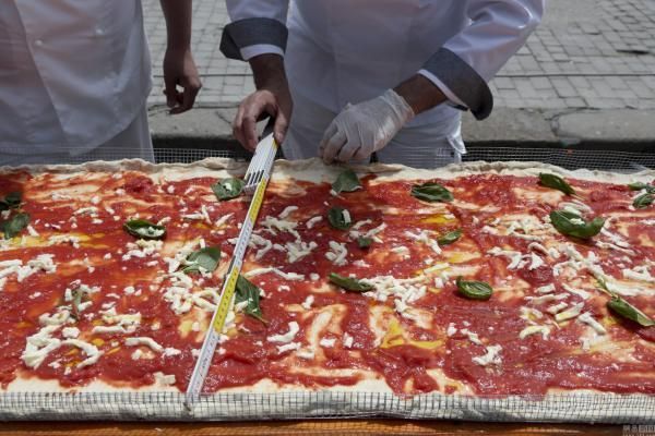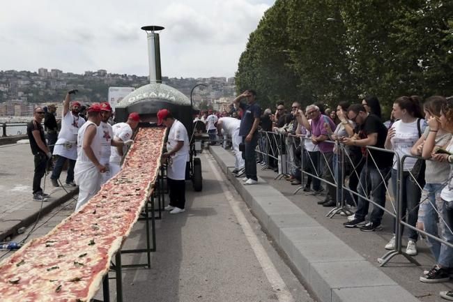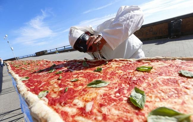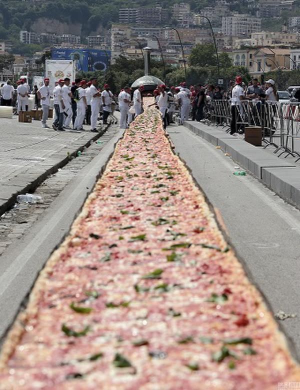 【新三才訊】美國人製作出了世界上最長的披薩餅,打破了先前義大利人保持的吉尼斯世界紀錄。這次活動由兩家烹飪器材製造公司在加州方塔納市舉辦。這一長約2公里的最長披薩,重達近8噸。它使用了約3.6噸的麵糰、1.6噸的乳酪和2.5噸的醬料製作而成。為了烤熟披薩,現場準備了三台工業烤爐,八小時不停歇地烘烤披薩。並且現場的烹飪專家和志願者每17分鐘就要移動烤爐,烘烤披薩其中的一段。圖為此前義大利披薩。