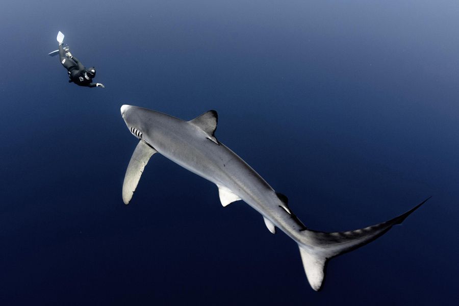 2.攝影師Alexandre Voyer是“關閉”類別的決賽入圍者。 航海家:“我的朋友亞歷克斯·魯波和我的女朋友瑪麗安·阿文特里爾,我們被一個偉大的朋友和水下攝影師弗雷德·布伊爾邀請到他的小亞太群島,這個位於大西洋中部的地方是-世界上與海洋野生動物相互作用的最佳景點當我們在開闊的海洋中遇到兩隻藍色鯊魚時,我們離開了Faial島的海岸,我們獨自一人在大西洋中部,水很黑暗, 而我們的翅片下面也許有二千米,這是一個難以置信的時刻。“