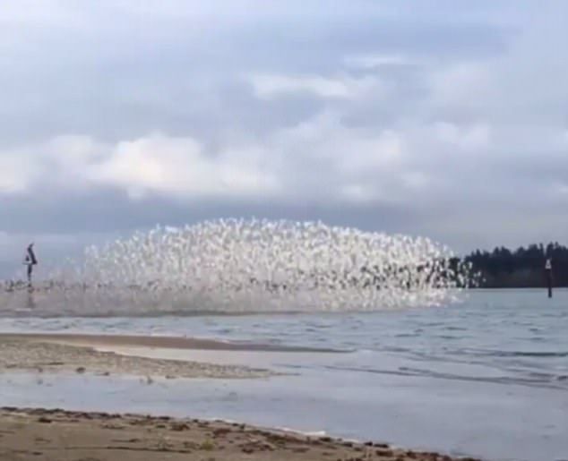 英國攝影師斯圖亞特•盧瑟福(Stuart Rutherford)拍攝了這則視頻。畫面顯示,鳥兒成群結隊在沙灘上方來回滑翔,似模仿海浪漲落。它們動作整齊一致、迅捷優雅,像在為圍觀的人們表演,它們在陽光的照射下閃閃發光。