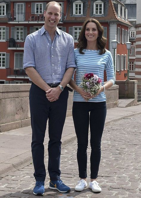 凱特特訪問了德國傳統的食品市場後,從她的黃色花邊Jenny Packahm連衣裙變換成,Hugo Boss藍色和白色條紋上衣以及牛仔褲以及Superga鞋子。