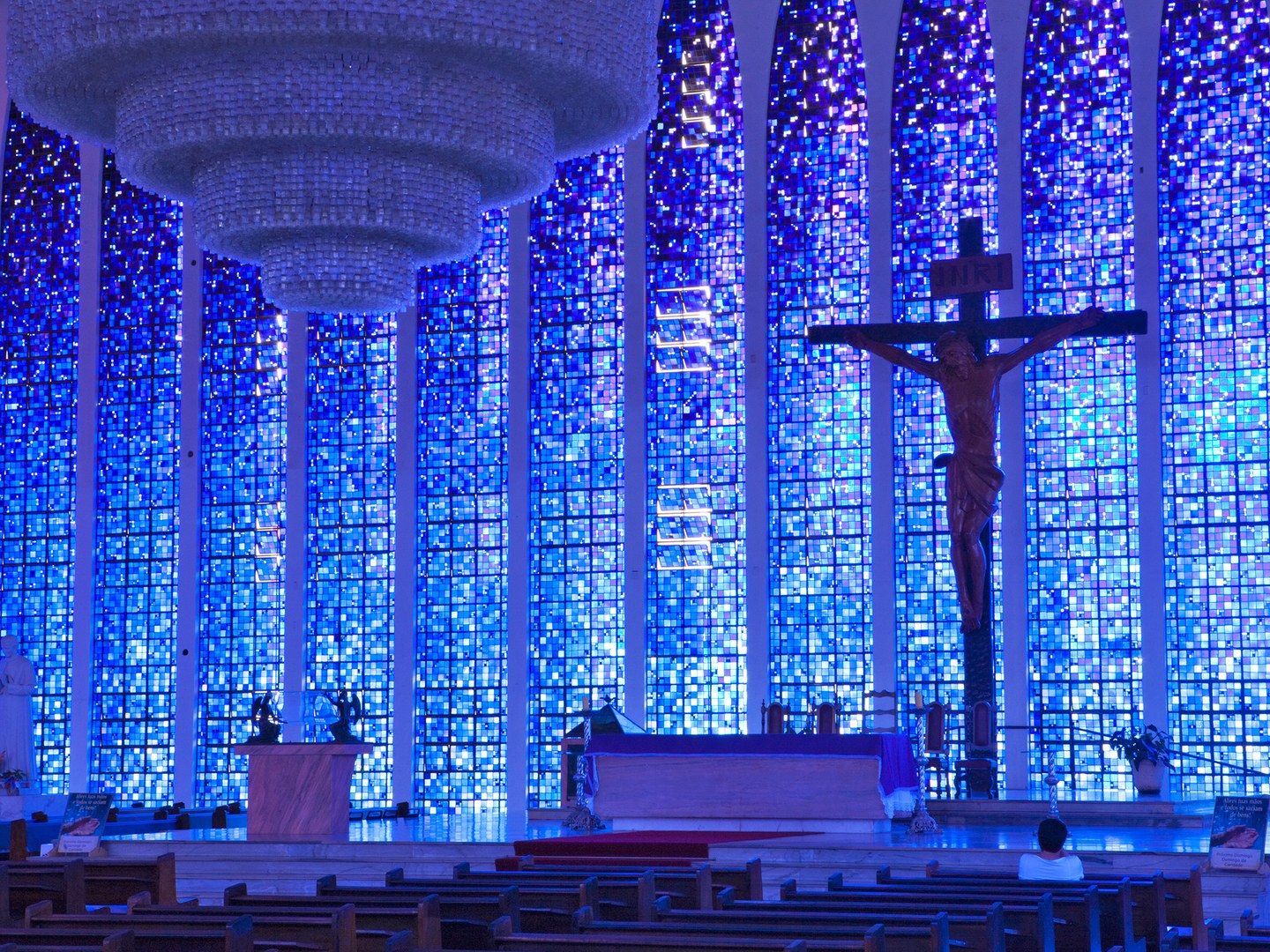 Santuário Dom Bosco,巴西從外面看來,Santuário Dom Bosco不僅僅是一個平淡無奇的混凝土箱。其內部真正壯觀,落地窗在整個空間投射出天光。這些玻璃牆由很多藍色玻璃組成,呈現出如滿天星空的風景。