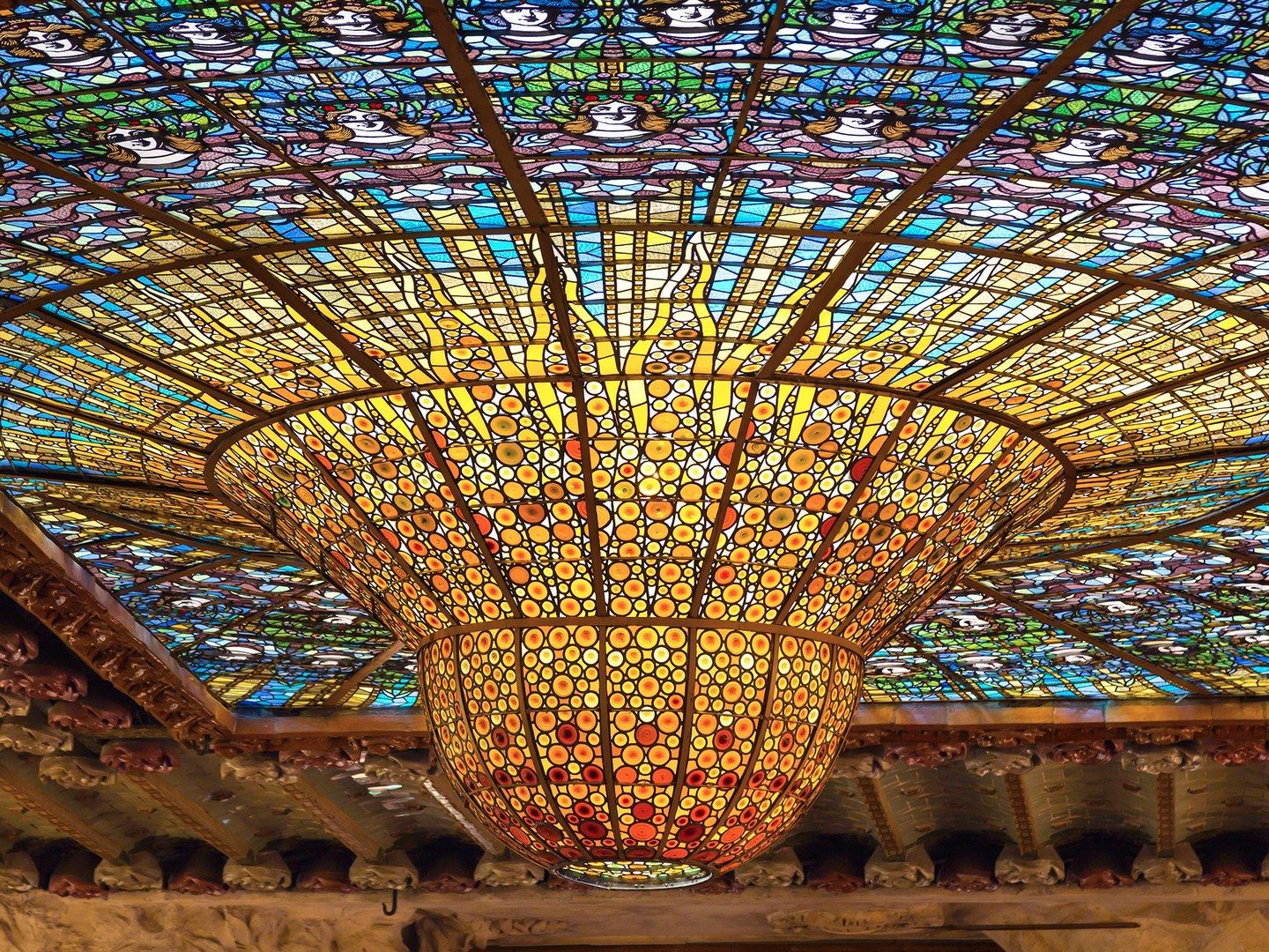 Palau de la Música Catalana,西班牙另一個巴塞隆納的主要作品是Palau de la Música Catalana,是加泰羅尼亞現代風格的最好的例子之一—由於它豐富的細節、花卉圖案和曲線。且由於其彩色玻璃牆和倒置的圓頂天窗,使音樂廳在白天完全由自然光照亮。