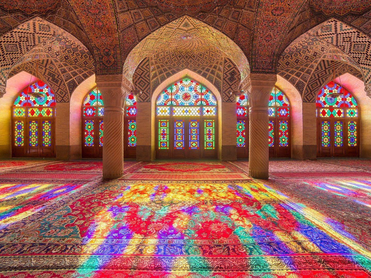 Nasir Al-Mulk Mosque,伊朗Nasir Al-Mulk Mosque由於其玫瑰色瓷磚而被稱為“粉紅色清真寺”。清真寺最好看的時間是在清晨,當陽光照耀著彩色的玻璃窗,你就像走進巨大的萬花筒。
