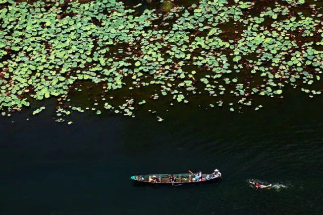 因此,乘一葉扁舟,漫遊此間,是最好不過的了,一點竹篙,看層層波紋四散,也別有一番滋味。