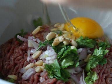 把牛肉、洋蔥、芫茜、松子仁混合。打入一隻蛋,再放入胡椒或鹽調味,最後放蔥粒和橄欖油,也可加入迷迭香增加香味。可加入一匙麵粉增加材料稠度