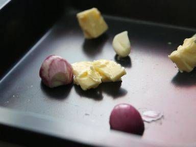 在烤盤內塗上牛油,灑上蒜瓣和紅蔥頭