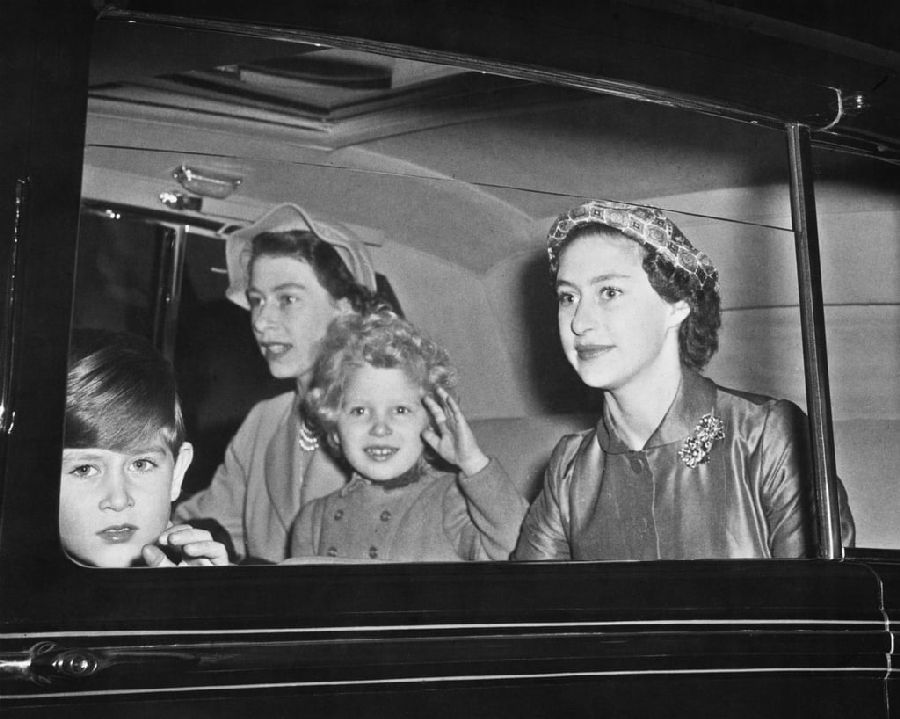 1954年10月10日:在蘇格蘭巴爾莫勒爾放暑假後,王室成員離開倫敦的尤斯頓車站(Euston Station)返回皇宮。圖為伊麗莎白女王二世、瑪格麗特公主、查爾斯王子、安妮公主。