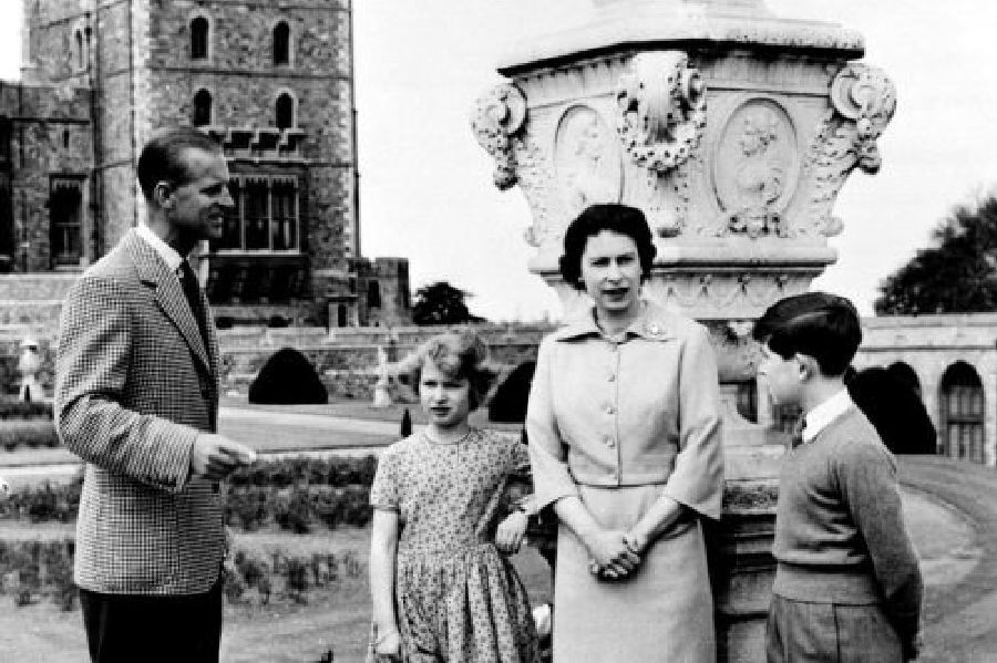 伊麗莎白二世、愛丁堡公爵、查爾斯王子、安妮公主,在溫莎堡東露台花園台階。