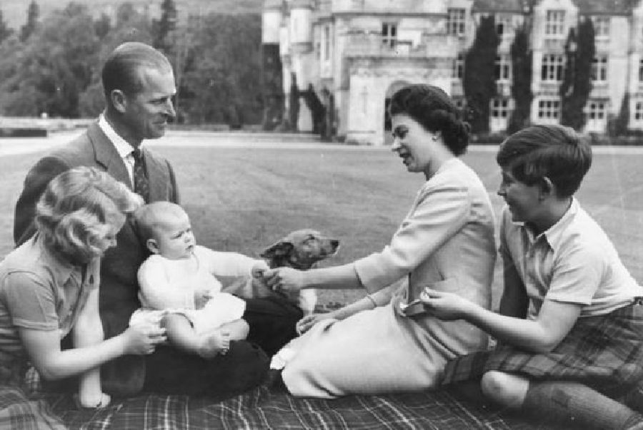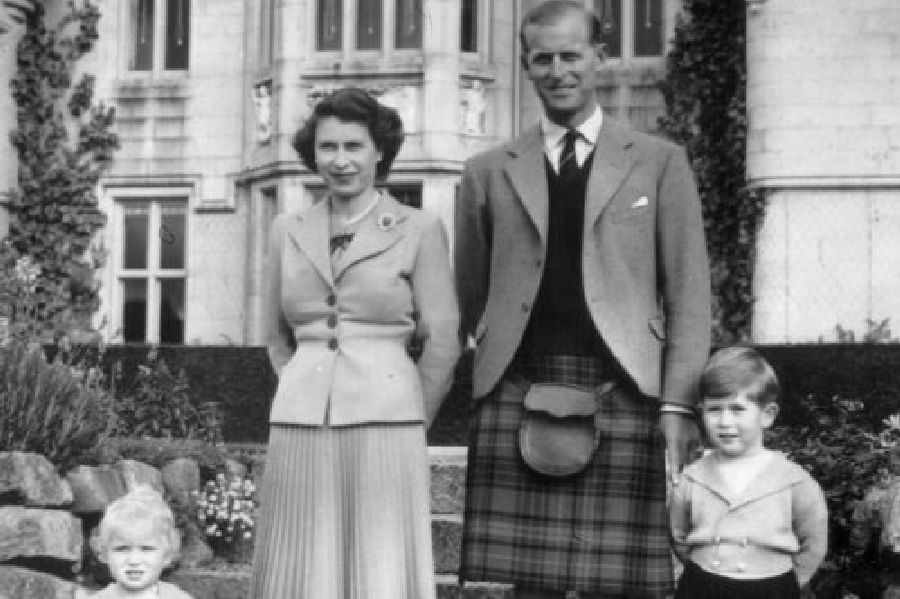 1952年9月19日:女王伊麗莎白二世、愛丁堡公爵、查爾斯王子、安妮公主子在蘇格蘭巴爾莫勒爾堡(Balmoral Castle)合影。