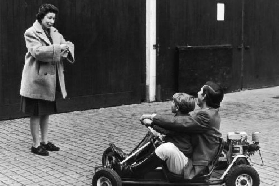 1969年4月:查爾斯王子與弟弟愛德華王子一起玩卡丁車(go-kart),而女王伊麗莎白二世則在旁觀望。