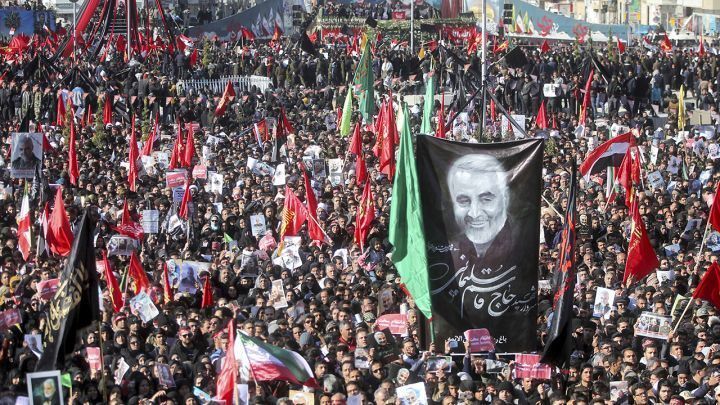 送葬者參加了於2020年1月7日在伊朗克爾曼市舉行的為在美國無人機襲擊中喪生的伊朗將軍Qassem Soleimani及其戰友舉行的葬禮。