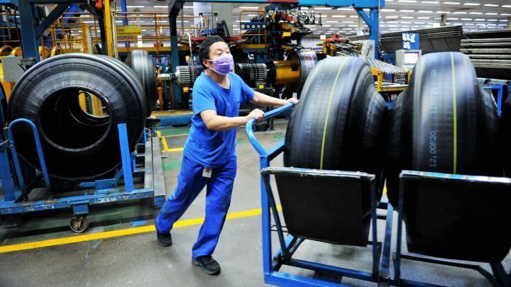 一名工人推著在中國東部山東省青島市一家工廠生產的輪胎手推車時戴上口罩。