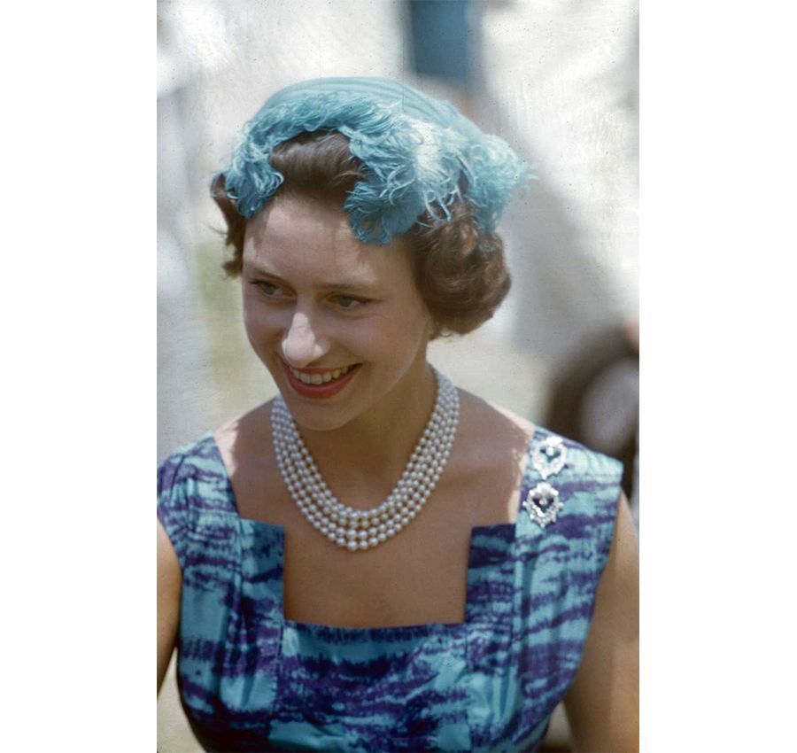 1956年,瑪格麗特公主在皇室巡訪東非各國時,戴著藍色羽毛帽子。