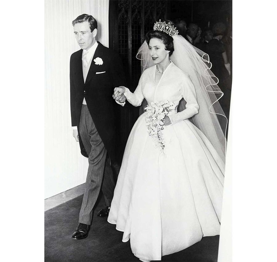 1960年5月6日,瑪格麗特公主和丈夫阿姆斯特朗瓊斯(Antony Armstrong-Jones)結婚典禮後,一起離開威斯敏斯特大教堂(Westminister Abbey)。