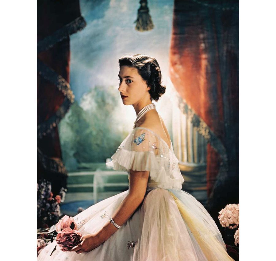 1944年,瑪格麗特公主為了畫肖像,穿著正式的晚禮服,手捧著粉紅色的玫瑰。