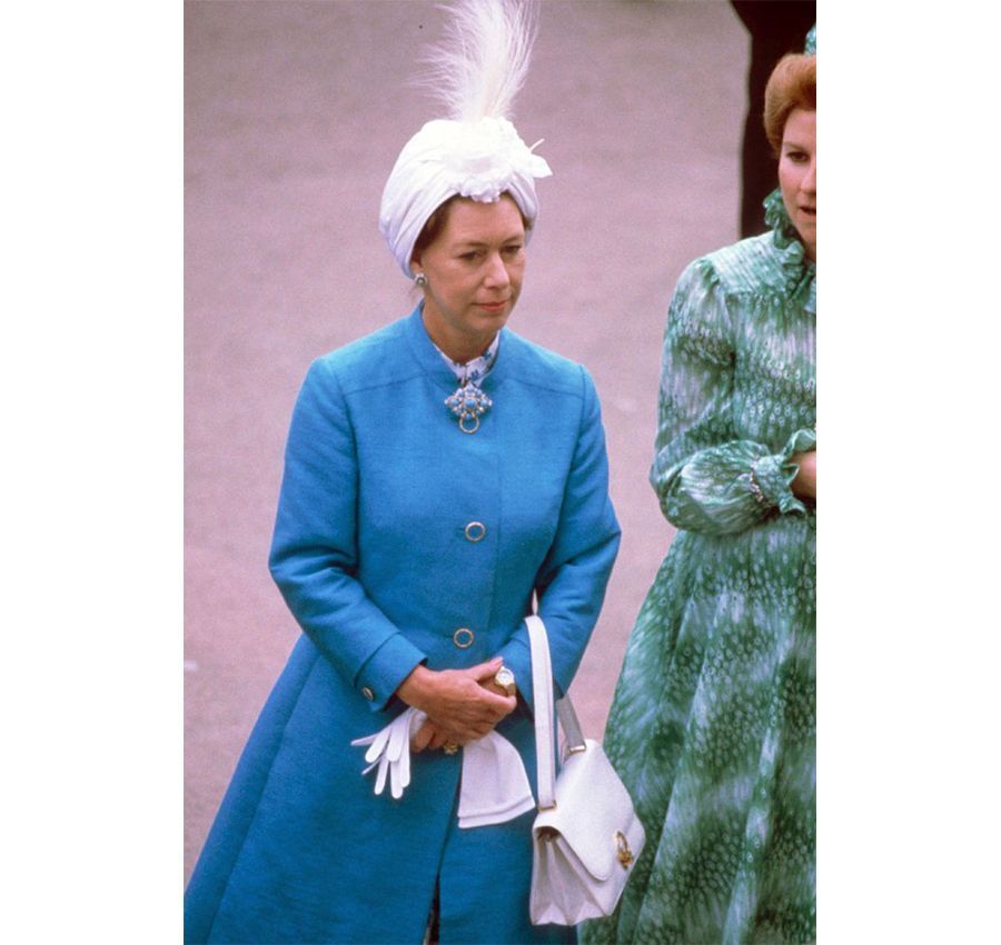 1981年,瑪格麗特公主身穿亮藍色外套,搭配羽毛頂的帽子,出席皇家賽馬會(Royal Ascot)。