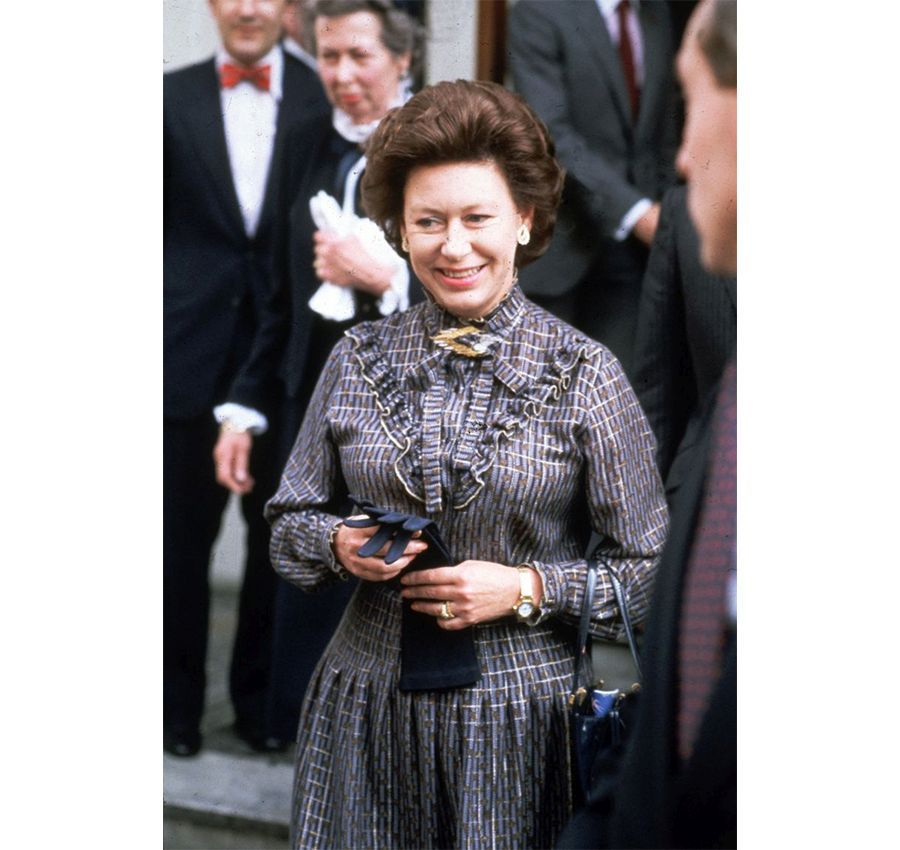1982年4月22日,瑪格麗特公主前往倫敦的頗爾購物中心(Pall Mall)參觀董事學院(the Institute of Directors)時,穿著有圖案的百褶裙。