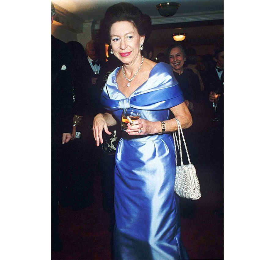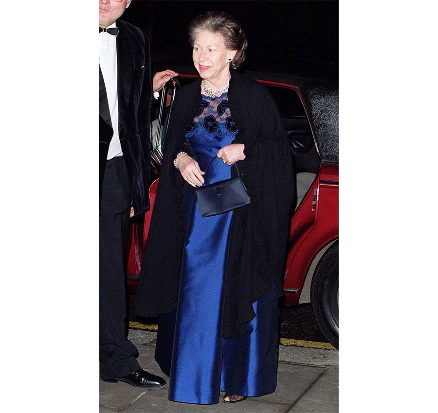 1990年7月19日,瑪格麗特公主穿藍色長袍,出席母后在倫敦的一場90歲慶生會。