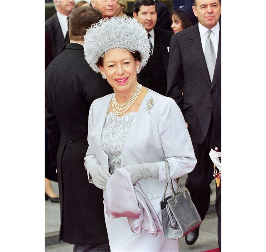 1996年,瑪格麗特公主穿著冰藍色上衣,在倫敦滑鐵盧車站(Waterloo station)迎接法國總統希拉克(Jacques Chirac)的到訪。