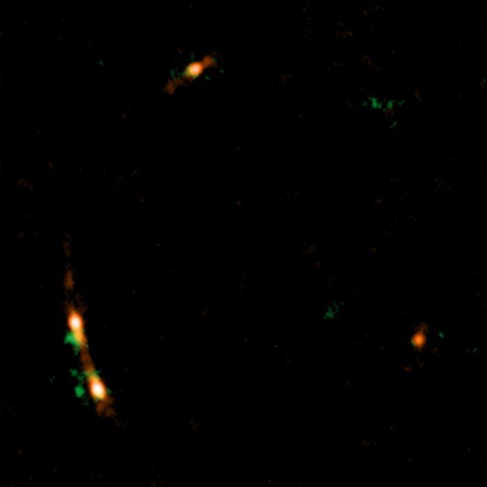 如果移除重力透鏡的效果,則MG J0414 + 0534的重建圖像看起來就像上圖。類星體周圍的塵埃和電離氣體的噴射流體以紅色顯示。一氧化碳氣體的噴射流體以綠色顯示,沿著噴射流體有著雙極結構。