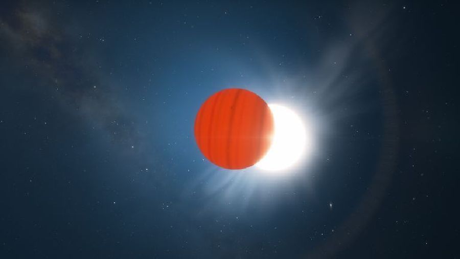 氣態巨行星「熱木星」(Hot Jupiter; Tau Boötis Ab)的示意圖,它有「外冷內熱」的特質,其核心被認為有高溫(20,000K)和高壓。