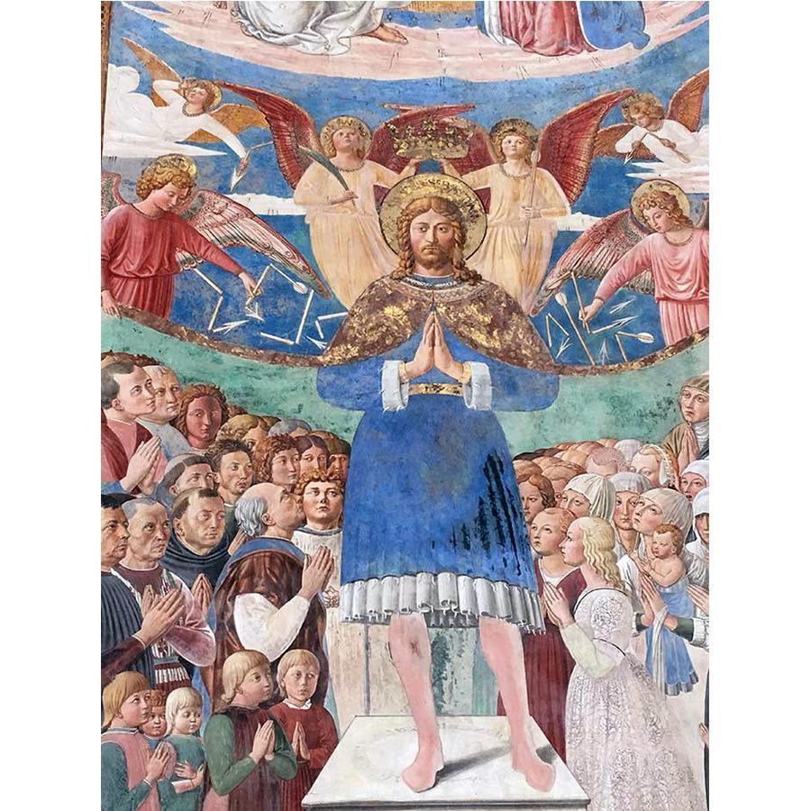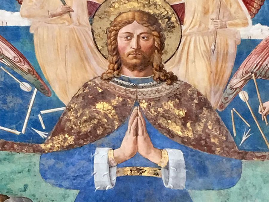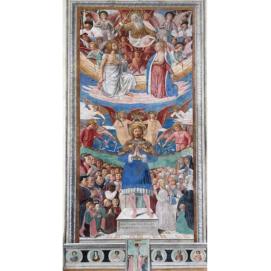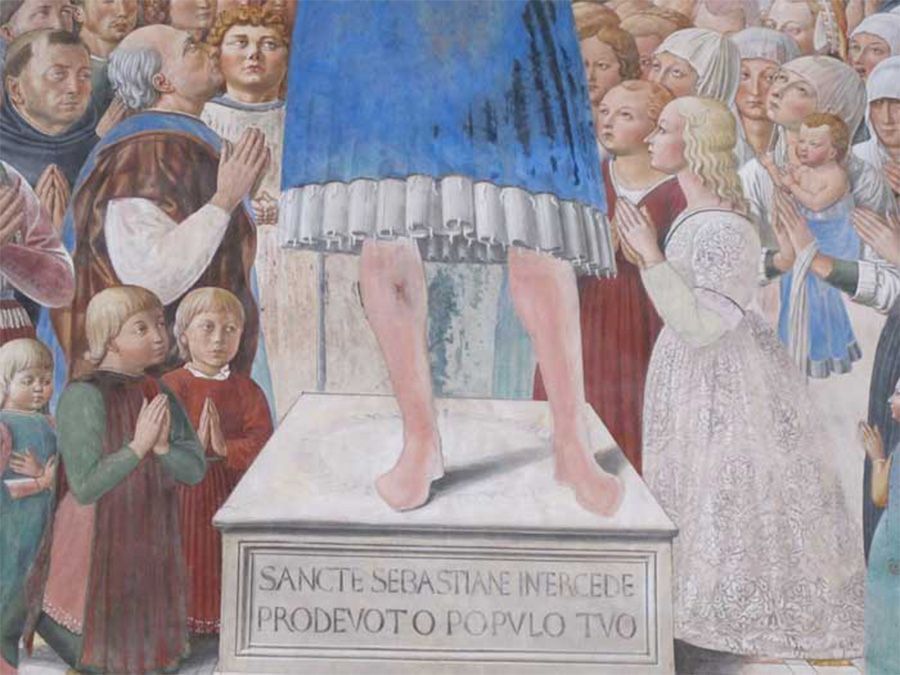 【新三才編譯首發】貝諾佐.戈佐利(Benozzo Gozzoli,1421 - 1497)是意大利文藝復興時期的畫家。在1464年,該鎮遭鼠疫襲擊之後,貝諾佐在聖吉米亞諾(San Gimignano)的聖奧古斯丁教堂(The chiesa di Sant'Agostino)中創作了壁畫。可以肯定的是,為了進行這項工作,他打破了主教堂以聖奧古斯丁生平故事的裝飾畫。與傳統繪畫相比,該壁畫的肖像畫非常不尋常是,在傳統繪畫中,聖塞巴斯蒂安(St. Sebastian;256-288)只穿著纏腰布,綁在樹或柱子上。如圖所示,聖塞巴斯蒂安站在天使支撐的基座上,穿著束腰的束腰外衣,並打開了一件大披風,以保護人們在他腳下祈禱。在基座上的一個銘文標示,其完成日期為1464年7月28日。