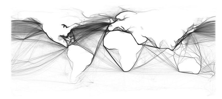 航運日誌:航運一直是全世界的一個巨大產業,上圖為1945 年全球航運頻率的圖示,它們確實是相互關聯的。