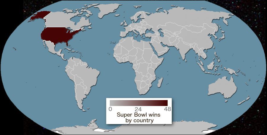 全球超級碗賽事:美國人喜歡橄欖球(就是豬皮球)。上圖顯示舉辦超級碗橄欖球賽事的國家。令人驚訝的是,這只有美國!