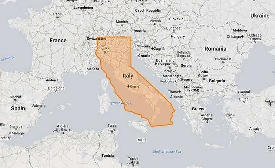 美國加州vs意大利:美國加州是一個巨大的州,實際上可能單獨成一個國家。這也是它獲得 55 張選舉人票的部分原因。但是,把它疊在意大利的地圖上時,您會看到二者加州更寬,但長度相同。