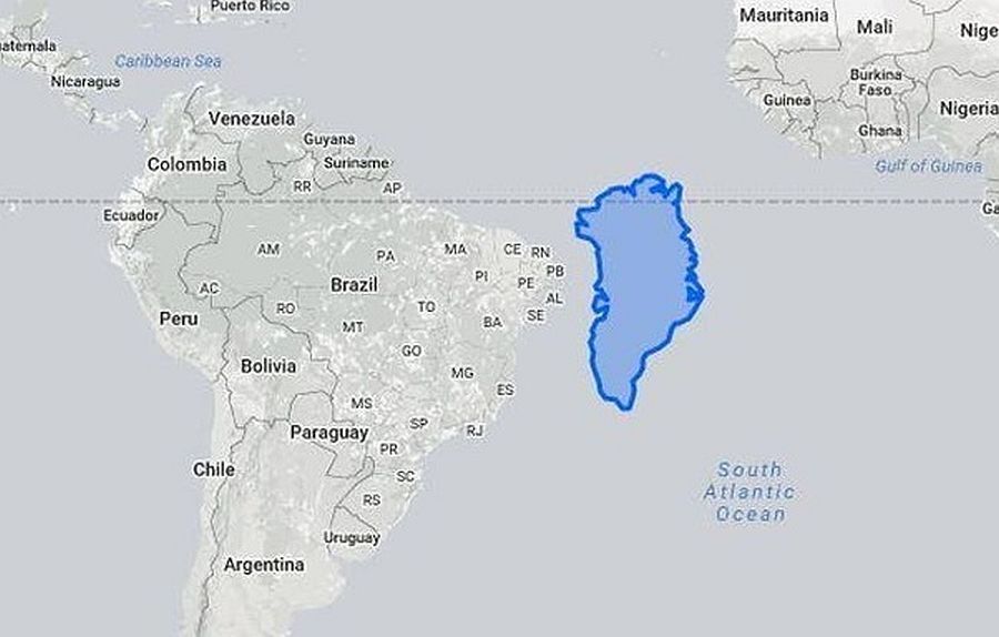 南美 vs格陵蘭(Greenland):很難想像陸地到底有多大。上圖右側標示南美洲旁邊的格陵蘭島。和左邊的南美洲巴西(Brazil)相比,就該自嘆不如了。